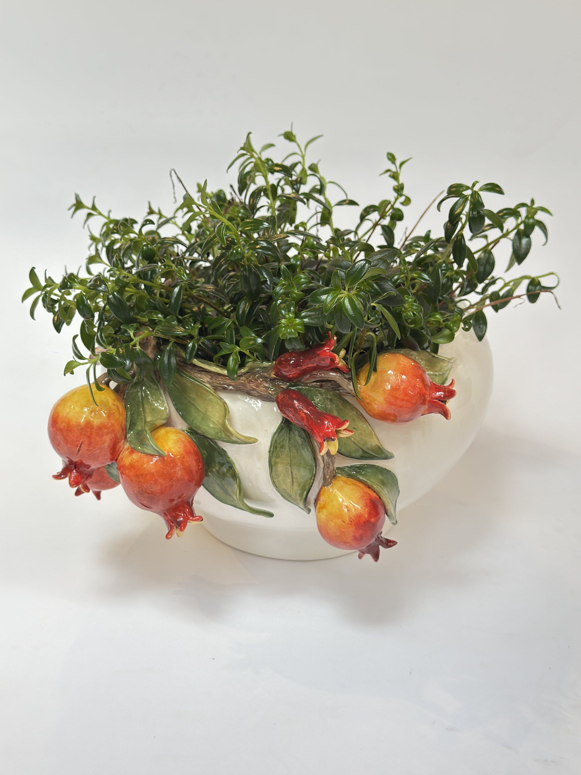 Design e Arte: O corpo da peça, em cerâmica branca vitrificada, destaca-se pelo brilho e pela pureza de suas linhas orgânicas. O grande diferencial reside no detalhamento escultural: um galho naturalista que se estende pela lateral da peça, carregado de romãs em diferentes estágios de maturação, com tons que variam do amarelo alaranjado ao vermelho vibrante. As folhas verdes com acabamento brilhante completam a composição, conferindo um realismo tátil impressionante.